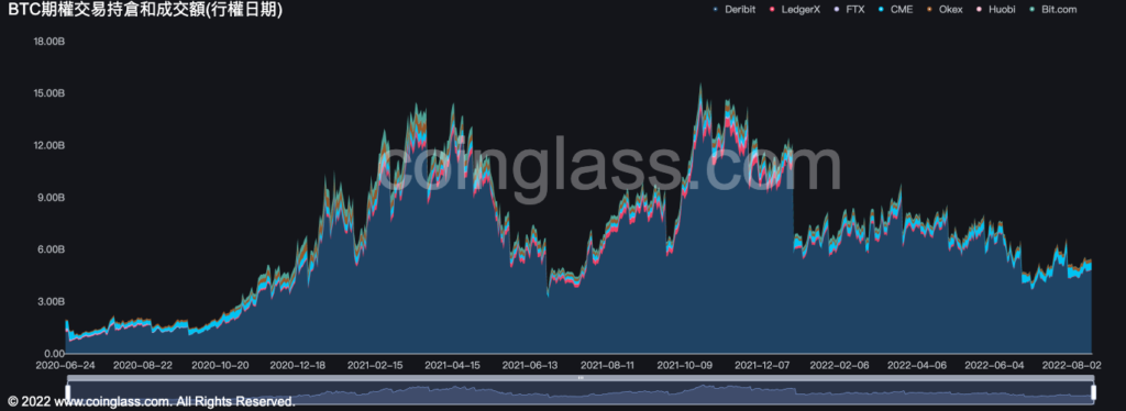 以太坊近日挑戰兩千美元的前高失利,持續在 1,900 美元附近震盪;比特幣也同樣在 2.4~2.5 萬之間來回震盪,尚未出現明確的價格趨勢。不過以太坊期權持倉量仍在超 80 億美元的高點。