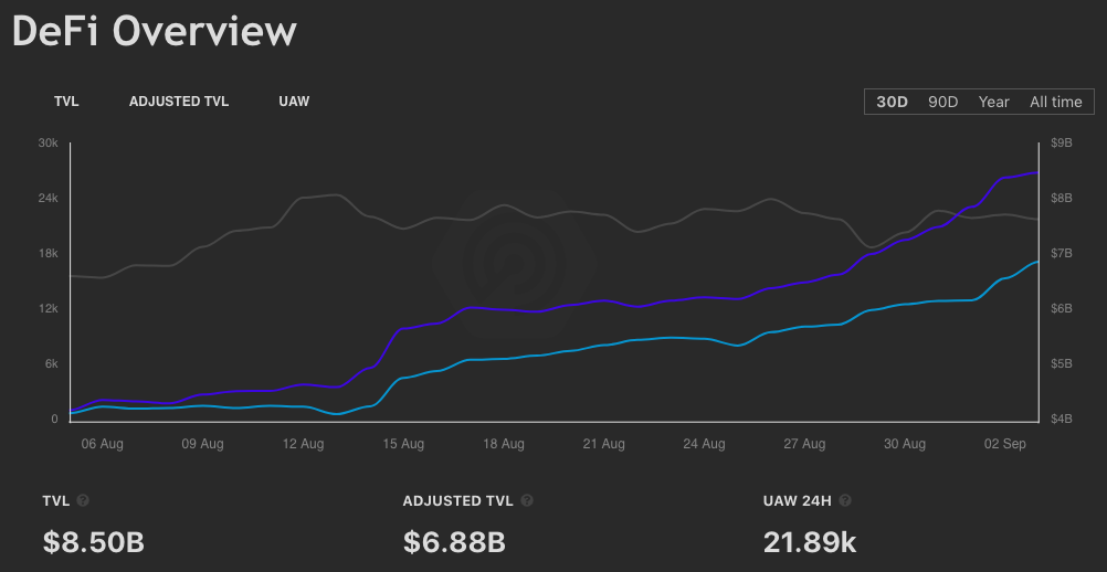 分析師將飛漲的交易成本歸因於 DeFi 過度炒作。年初,DeFi 的總鎖定價值(TVL)才剛跨越 10 億美元大關,轉眼到 8 月就突破了 90 億美元,DeFi 治理代幣也多有數十至數百倍的漲幅。從 DappRadar 數據可以看到, DeFi 目前總鎖倉(TVL)價值達 85 億美元。