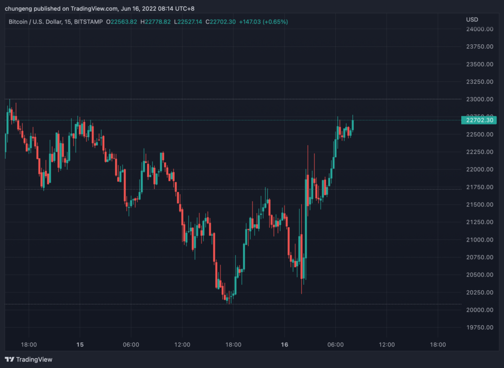 加密貨幣市場方面,比特幣也受到積極影響,在今(16)日深夜最低觸 20,250 美元逼近 2 萬美元大關之際,於加息結果 02:00 曝光後開啟強勁反彈。稍早一度逼近 2.3 萬美元,六小時上漲近 13%,現報 22,702 美元。