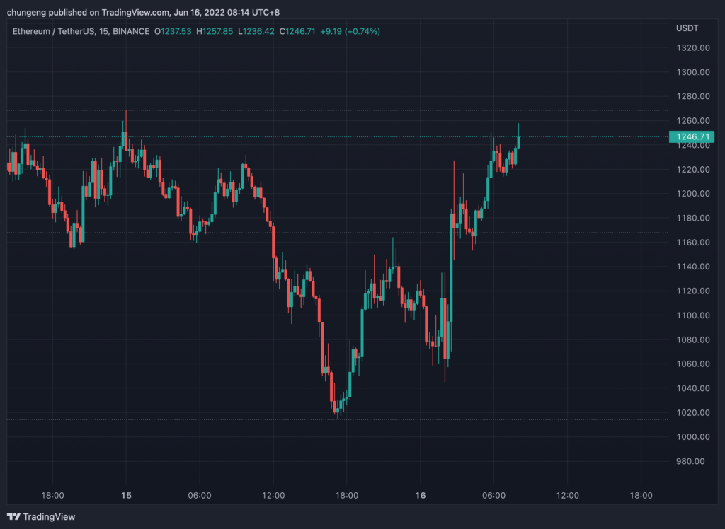 以太坊同樣在一度逼近 1,000 美元後開啟反彈,至截稿前回升至 1,246 美元,近 6 小時上漲幅度高達 20 %。