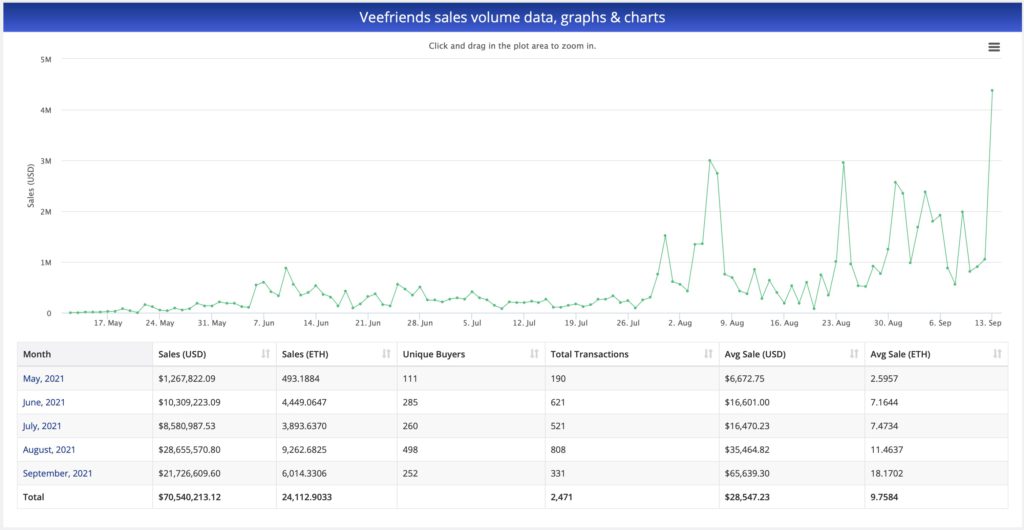 根據 CryptoSlam 數據,今年 5 月份推出的 VeeFriends NFT 迄今為止,交易總量已超過 7,000 萬美元。
