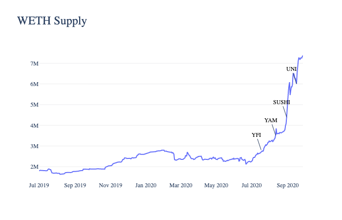去中心化交易所崛起的另一個體現是 WETH(Wrapped ETH)的數量增長。