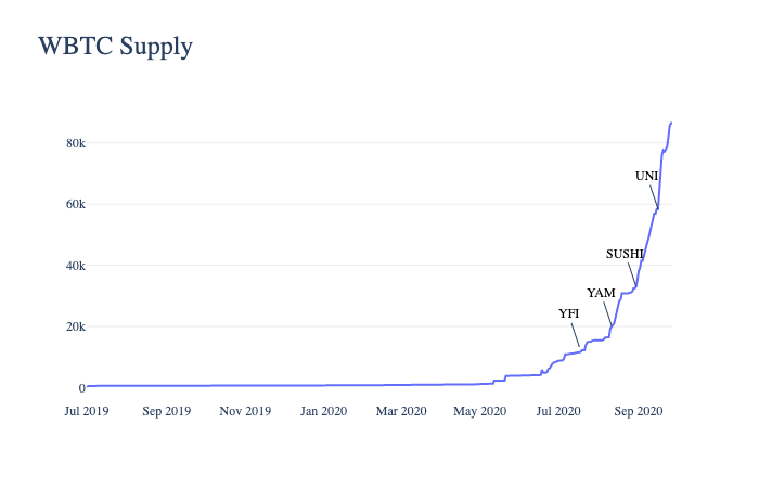 隨著 DeFi 的發展,WBTC(Wrapped BTC)的供應量也在不斷增長。