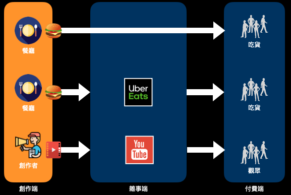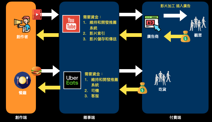 把第一張圖加上金流,以及平台處理的雜事:吃貨願意對 UberEat 所有的成本買單,但觀眾比較少會因為觀看影片為 YouTube 所有的成本買單。於是有了廣告商,如果不想看廣告,觀眾只能付費訂閱。