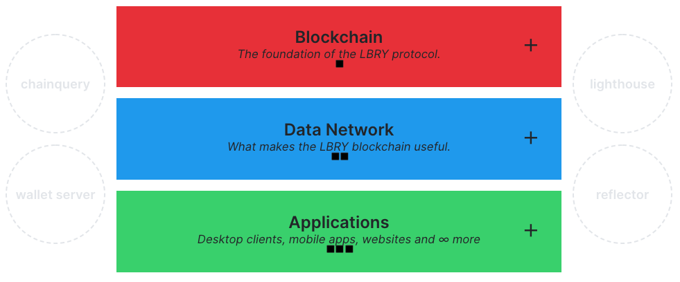 LBRY 官方公布的技術模組生態如上圖,三大架構層包含區塊鏈層(紀錄索引、Metadata 等)、資料層(儲存內容等)以及應用層(手機 APP、電腦網頁版…等),以及四大元件區塊鏈訪問器 Chainquery、錢包伺服器、中繼資料燈塔 lighthouse、內容託管器 reflector。