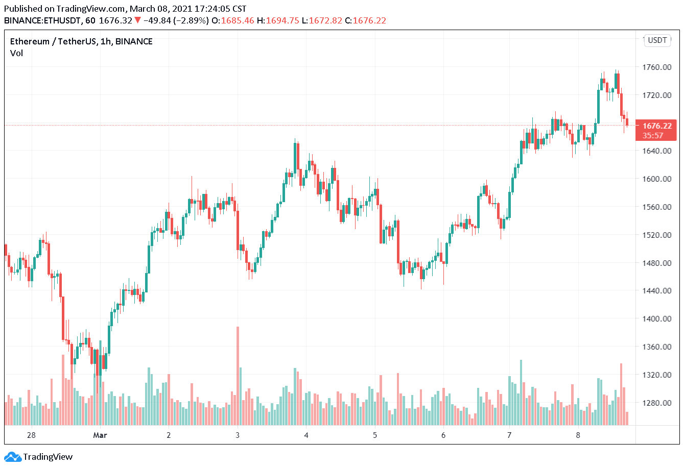 以太幣價格自 2 月下旬站上 2,000 美元刷新歷史紀錄後,便向下修正,目前已經從本月初 1,300 美元附近緩步回升。根據 Trading View 數據,以太幣本日下午最高來到 1,755 美元,距離今天 1,633 美元低點上漲 7.5%,至截稿前價格報為 1,676 美元。