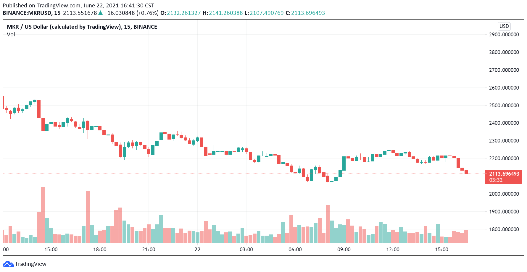 受加密貨幣市場回調影響,MKR 在過去 24 小時內自 2,600 美元一度跌至盤中低點 2,060 美元,過去 24 小時跌幅來到 8.75%,截稿前報價 2,124 美元。