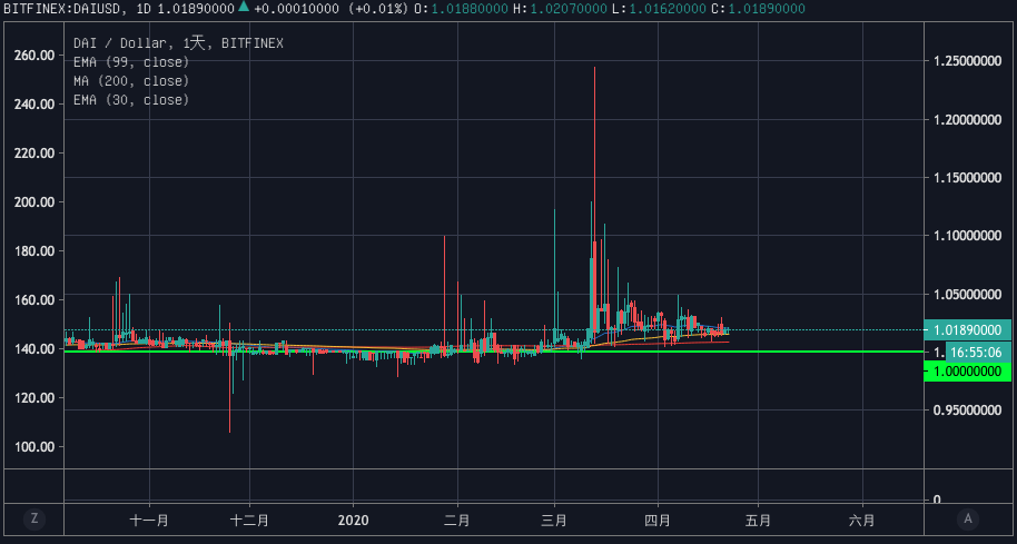 自上月聯準會宣布 QE 後,去中心化穩定幣 DAI 已經溢價超過一個月(下圖),因此,MakerDAO 的治理社群已在 4 月 20 日通過將 DAI 的穩定費(Stability fee)調降至零。這意味著和 MakerDAO 借錢零息,用這種方式,增加發行量,藉此解決溢價問題。