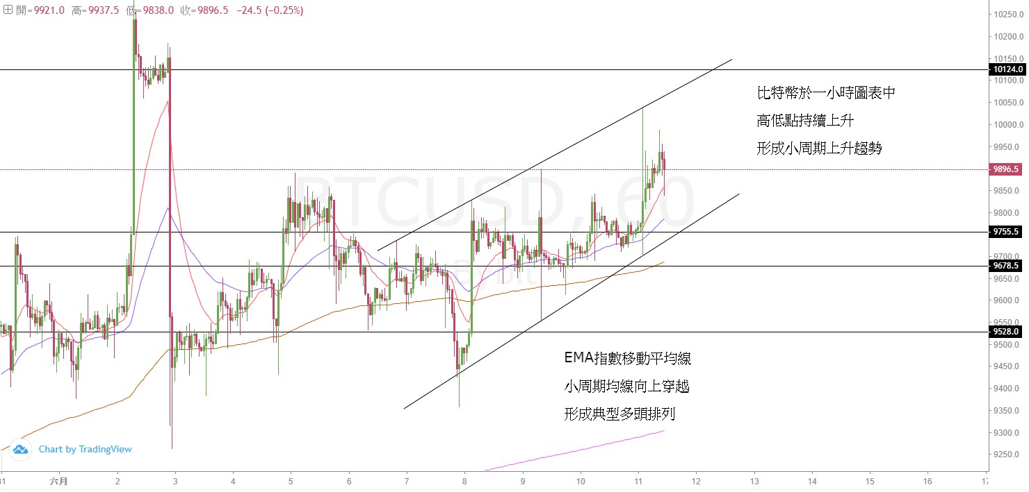 「目前,我們在看到 BTCUSD 的一小時 K 線圖表內可以看到比特幣低點與高點逐漸上升形成趨勢線,形成標準的上升趨勢,且 EMA 指數移動平均線的小周期均線向上穿越,並且開口發散,形成多頭排列,可以判斷短期內多頭走勢較強。」