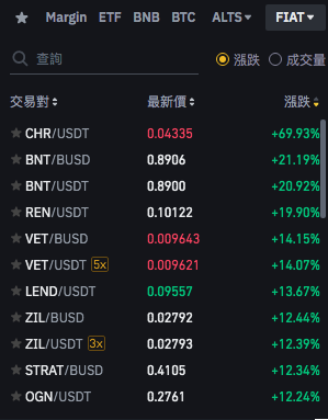 市值較小的競爭幣更是輪番暴漲。例如上個月才上架的 CHR 代幣在過去的 24 小時就上漲了 69%,令人咋舌,BNT 和 REN 也在 24 小時內上漲了將近 20%。