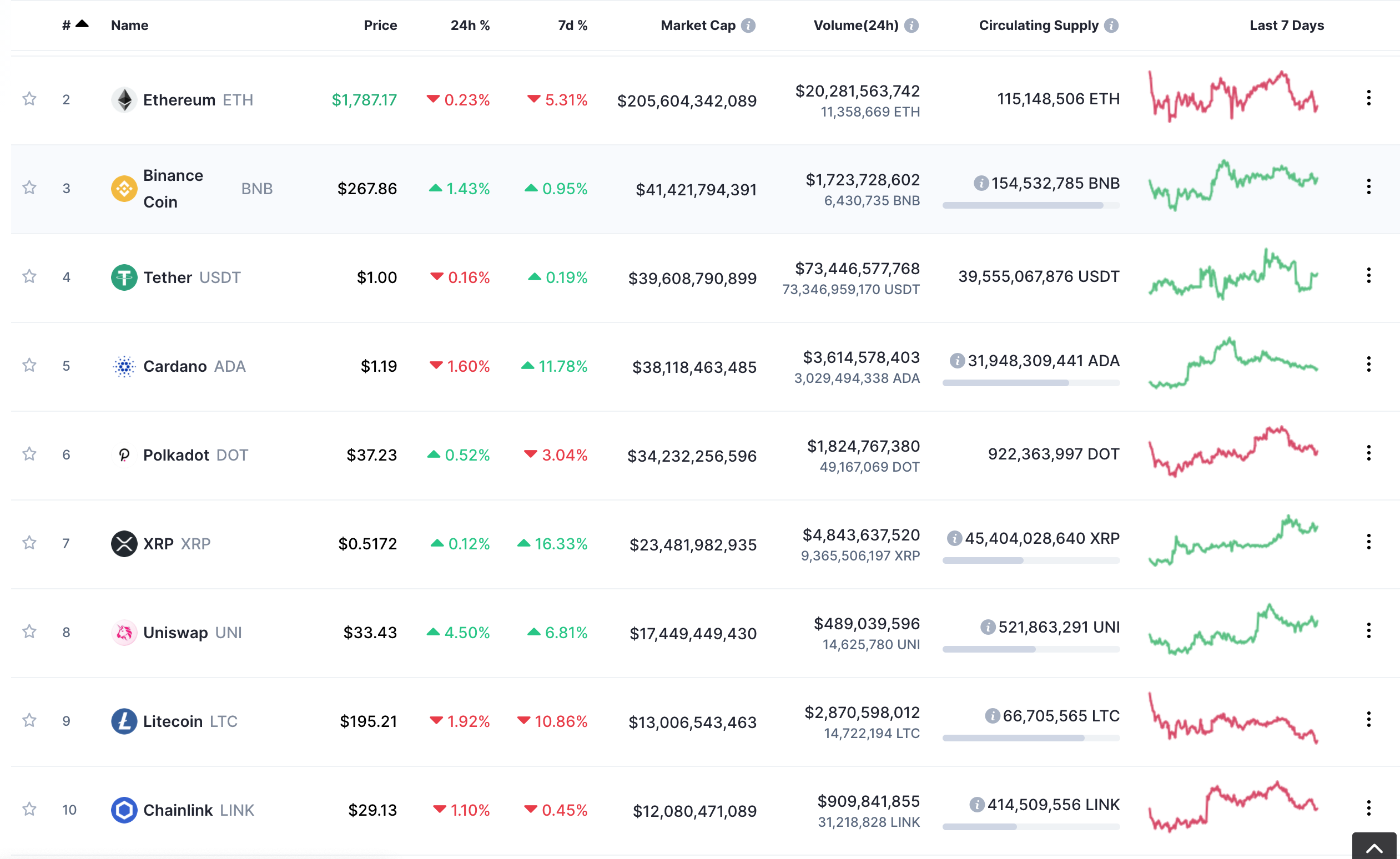 其他競爭幣幣價表現上,上週幣安幣(BNB)持續上揚,漲幅達 2.07%,報267 美元;Cardano(ADA)下跌 7.8%,報 1.19 美元;波卡幣(DOT)下跌 3 %,報37.04美元;瑞波幣(XRP)逆市漲逾 10%,報 0.5145 美元。