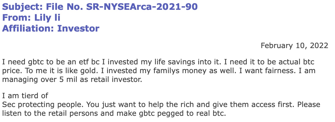 另一位署名 Lily li 的用戶則表示:他已將畢生積蓄投入了該基金,並且厭倦了美國證券交易委員會試圖以保護人們的做法來拖延,他認為監管機構只是為了「幫助富人。