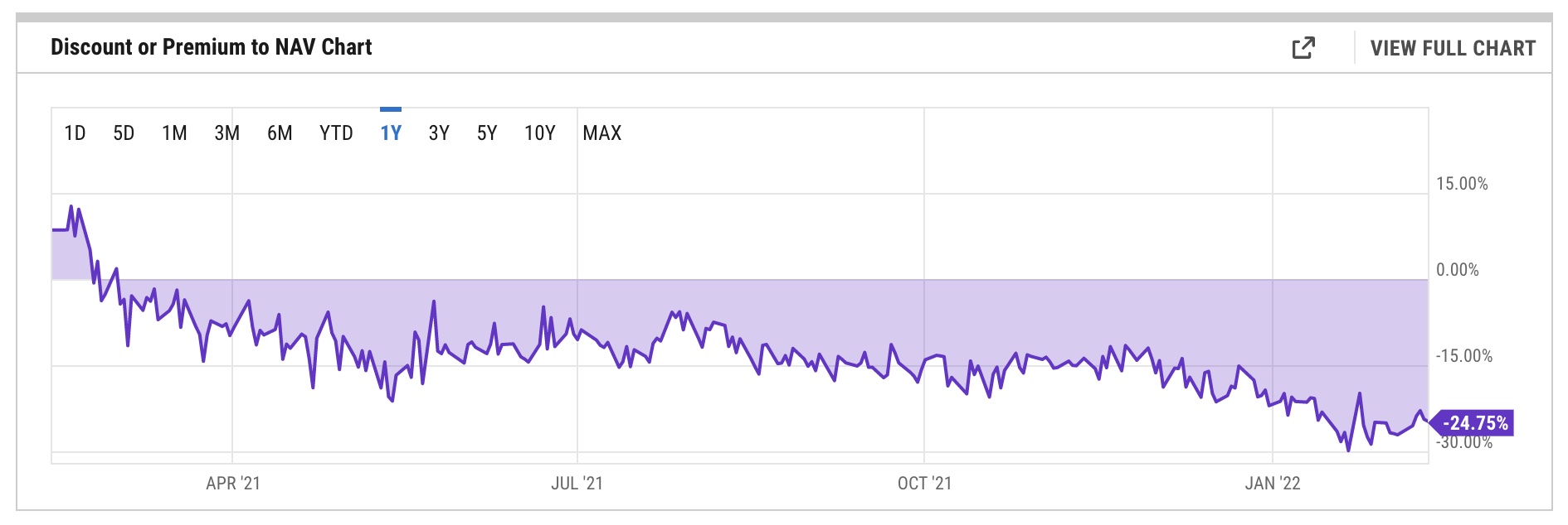 這意味著,以 BTC 目前的價格在 43,000 美元左右,基金折價將相當於 32,350 美元左右。