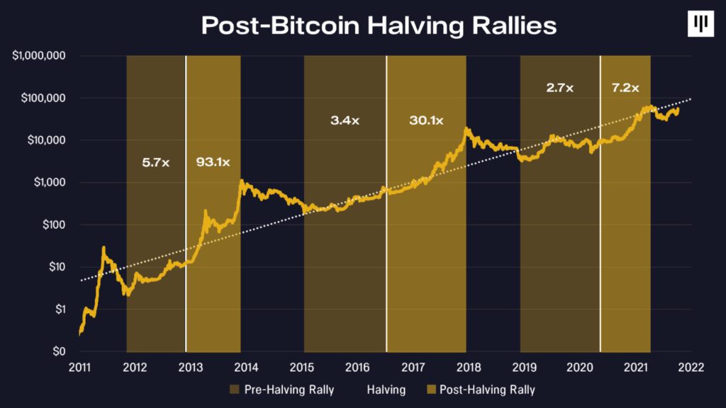 最後一次減半則是在 2020 年 5 月 11 日,這進一步減少了新 BTC 相對於流通供應量的數量,此後比特幣上漲了 7.2 倍以上,可觀察到減半對比特幣價格的影響越來越小。