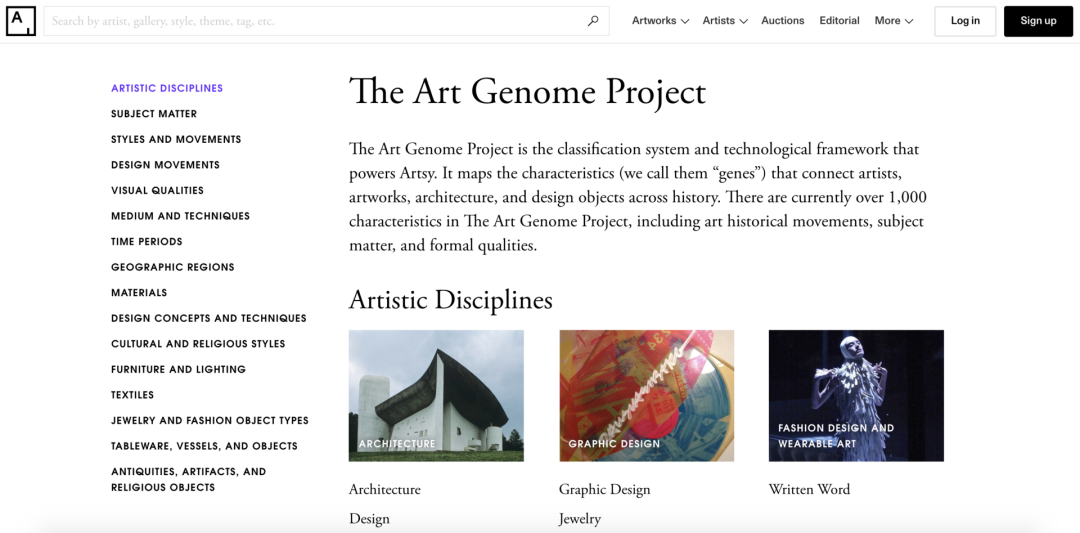 傳統藝術界裡,值得借鑒的是 artsy.net 。Artsy 建立於 2009 年,鄧文迪是共同創辦人。相比於別的線上藝術交易平台,它令人印象深刻的點在於它對於它們線上包含的所有藝術品進行了細分標籤,稱為“The Art Genome Project”(它的 github 頁面 ),包括每一種流派、時期、材質、技法、主題等等。