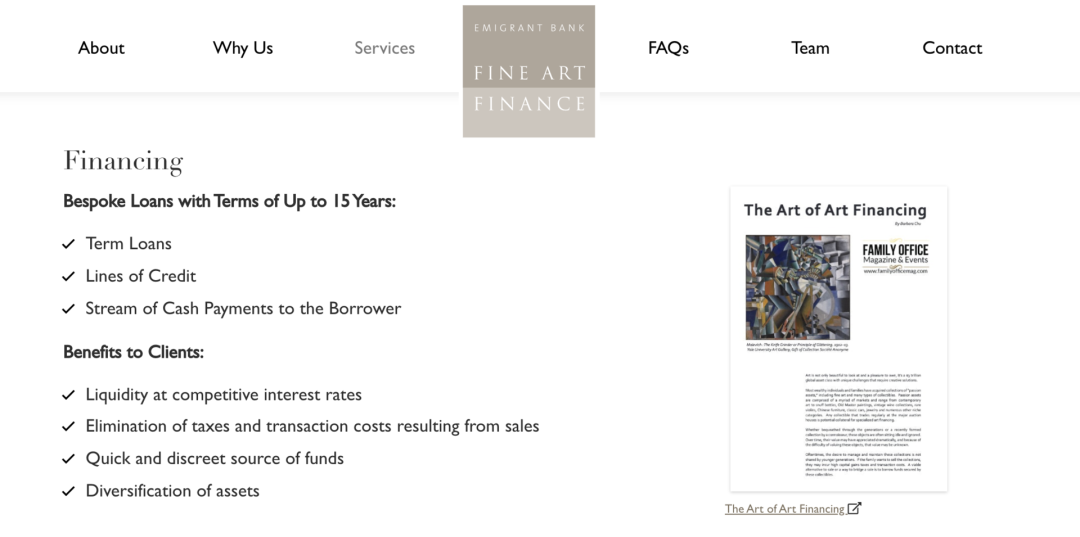 – Emigrant Bank給客戶提供的藝術品融資服務 –