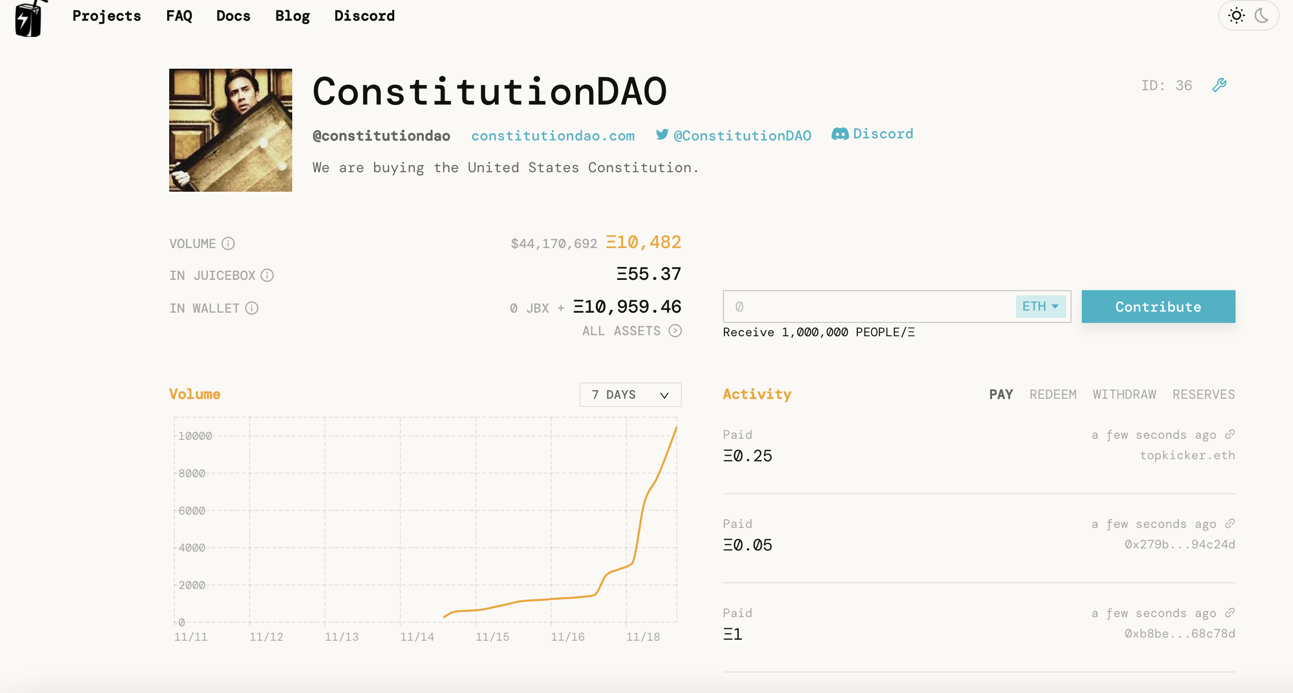 根據 ConstitutionDao 貢獻者 Packy McCormick 的說法,DAO 於 14 日開始透過募款平台 JuiceBox 籌募資金,在開放後 12 小時內就籌集了 300 萬美元,之後款項更是不斷湧入,DAO 因此也持續地提高募資的上限。