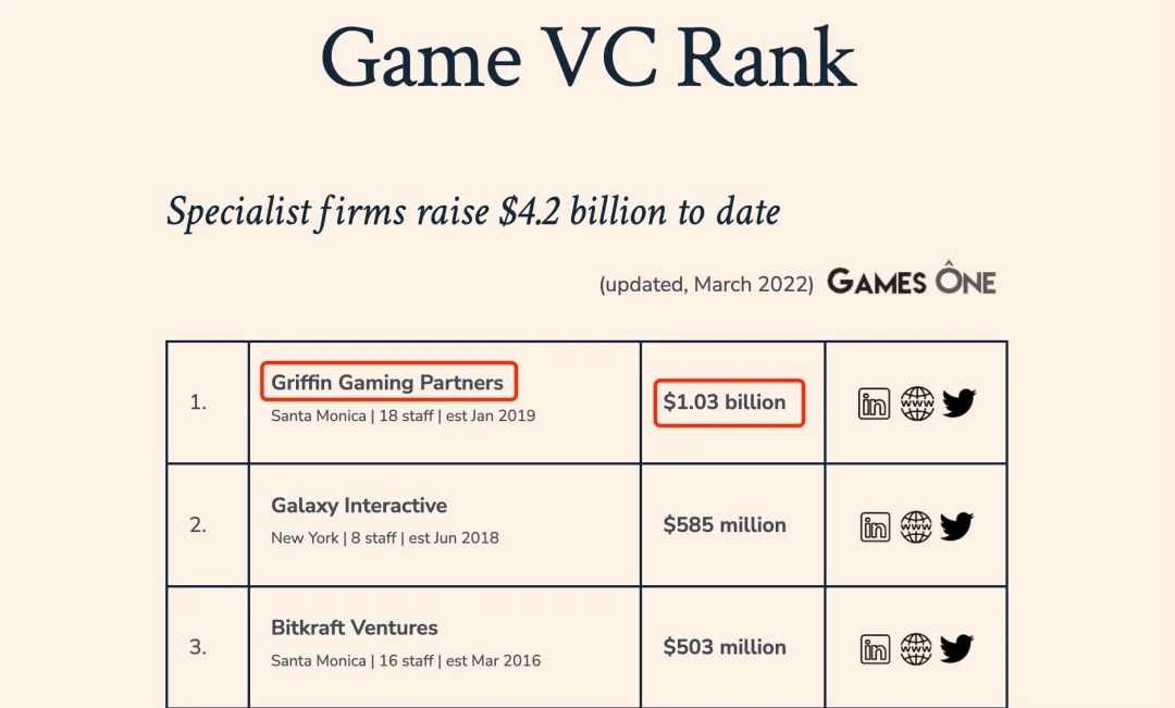 隨著「Fund II」的推出,也使得 Griffin Gaming Partners 成為了目前最大的遊戲基金。Games One 數據顯示,Griffin 的 AUM(資產管理規模)已達到 10.3 億美元。