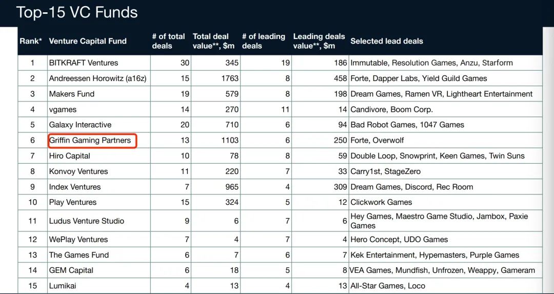而在旗下第二支基金獲得了 7.5 億美元超額認購後,Griffin Gaming Partners 也迅速成長成為了目前最大的遊戲基金。不久前,據 Invest Game 發布的 2021 年遊戲投資數據,Griffin 在遊戲領域前 Top 15 VC Funds 中還只排在了第六位。