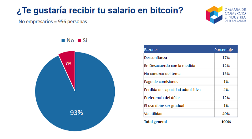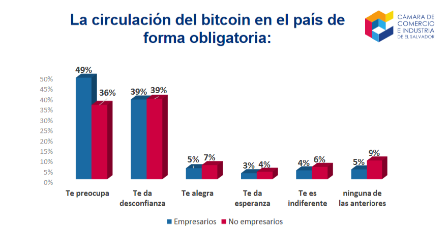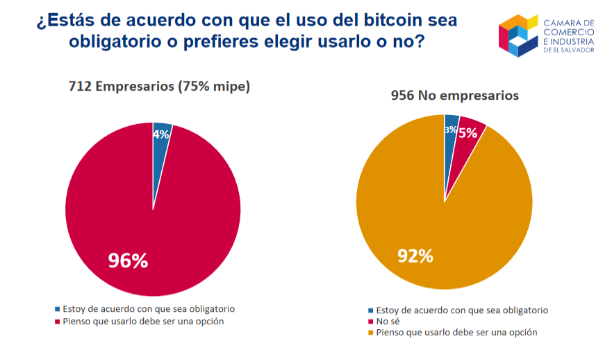 其中 96% 的企業家希望比特幣支付的選項是非強制性的,但在該國比特幣法案中,未來企業接受比特幣付款為強制性的。另有 45% 的人擔心加密貨幣在該國的流通是強制性的,35% 的人則認爲人民會因此對法幣體系感到不信任。