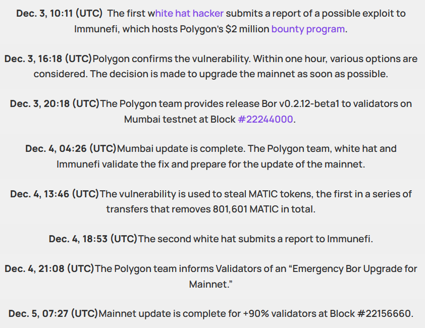 根據官方的《關於本次升級,你該知道的兩三事》聲明,12 月 3 日有白帽駭客將 Polygon 創世合約中的超級漏洞通報給漏洞賞金平台 Immunefi,該漏洞允許攻擊者透過 MRC20 合約轉移函數缺乏限額檢查的問題,允許駭客盜取超過 92 億顆 MATIC(價值超過 240 億美元),而 MATIC 的總量也不過 100 億,足見該漏洞之嚴重性。