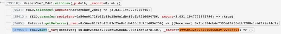 隨後,攻擊者通過在合約中進行提現操作以獲取 YELD 代幣獎勵,獎勵的計算會除合約中 xYELD 代幣數量,而此時合約中 xYELD 代幣數量是一個極小的數量,所以導致除法計算後獎勵的數量變成一個巨大的值。