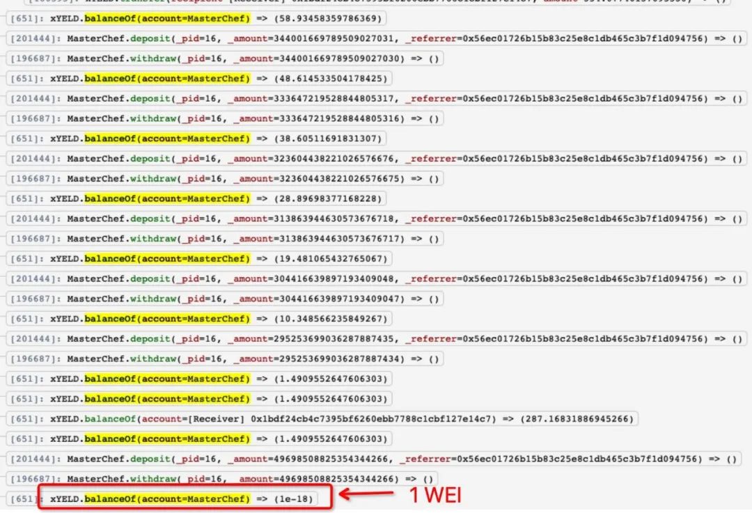 第二步,攻擊者利用 xYELD 通縮型代幣與 MasterChef 合約的兼容性問題,通過頻繁地進行「 抵押-提現 」操作,最終導致合約中的 xYELD 代幣數量消耗到一個極小的數量。