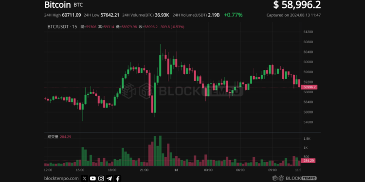 動區消息,BTC強勁上揚!在08/13 11:47衝破59000美元大關!近24小時漲幅達到0.77%、近一週漲幅達5.83%。