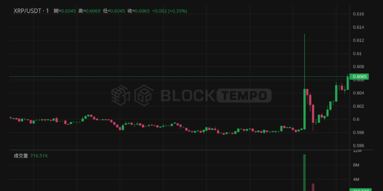 快訊》 XRP在5分鐘內大漲0.23%,達0.607美元!波動巨大請投資人注意風險