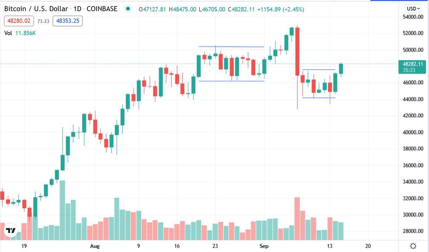 比特幣自從 9 月 7 日閃跌後,成長力道暫時受挫,爾後又遭 Walmart 假消息事件干擾而再度跌至 43k 左右,市場更傳出嚴重的期貨爆倉慘況。