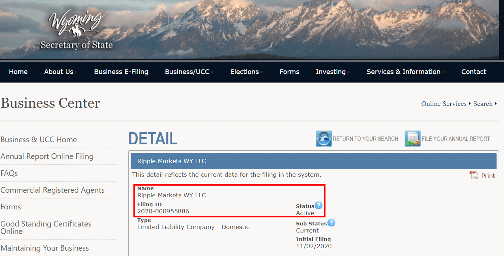 根據懷俄明州務卿(Wyoming Secretary of State)官網,區塊鏈公司瑞波實驗室(Ripple Labs)在當地開了一間本土公司 Ripple Markets WY LLC,首次送交申請日為去年 2 月 11 日,目前註冊登記已生效,狀態顯示為「營業中」。