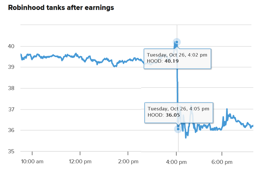 美國線上券商羅賓漢(Robinhood) 10 月 26 日公布 Q3 財報,由於加密貨幣交易收入銳減 78%,且季度、年度收入成長均未達標,消息一出 HOOD 的股價自 40.19 美元重挫至 36.05 美元,下跌超過 10%。