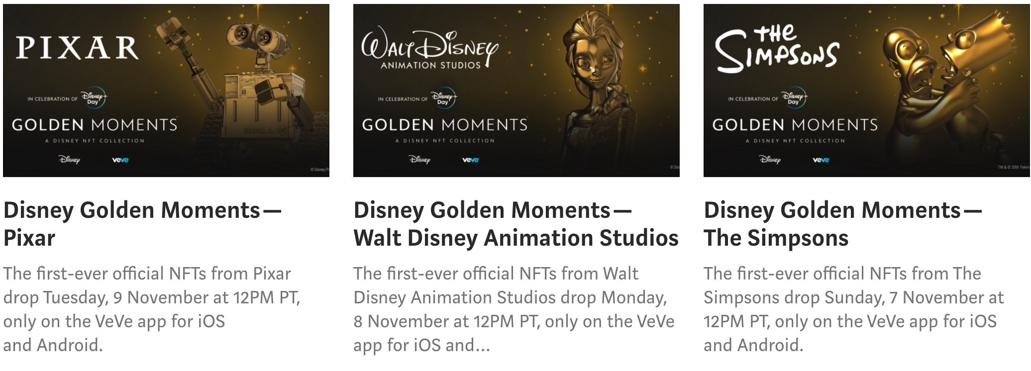 NFT 平台 VeVe 自 10 月下旬以來與迪士尼一同打造一系列的黃金時刻 NFT 系列活動,由辛普森家庭打頭陣,在 11 月 12 日的 Disney+ 日之前,一路上架更多其他 IP 至平台上。共 16,888 個辛普森盲盒 NFT 在開賣後迅速售鑿,每個 60 美元的 NFT,在外面拍賣喊價都有超過 150 美元的行情價,同時也計算該平台每週就可進帳 720 萬美元。