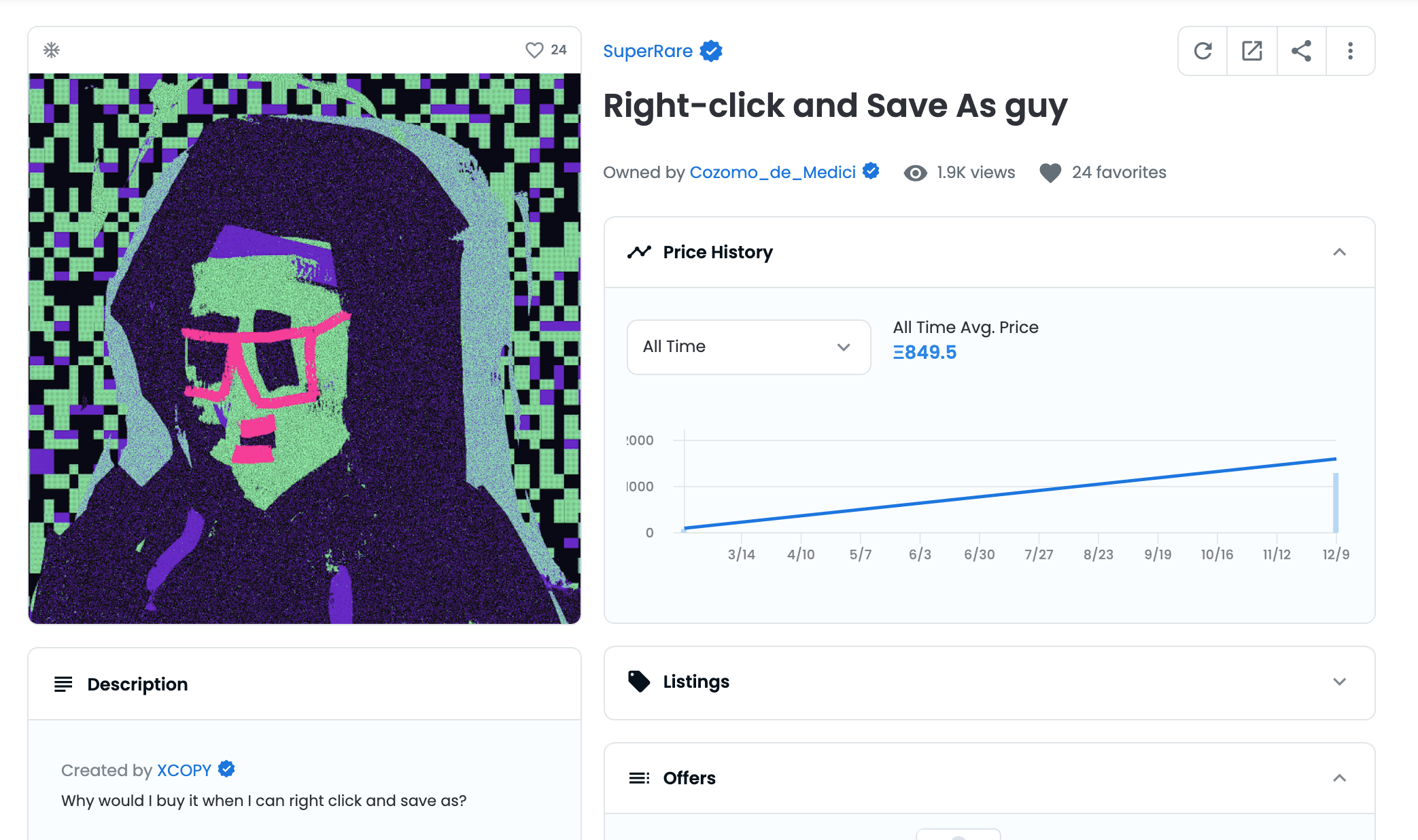 匿名 NFT 收藏家 Cozomo de’ Medici,今日以 1,600 ETH 約 700 萬美元,購入 XCOPY 的 NFT 作品《Right-click and Save As guy》。Medici 隨後在推特上發表感言,表示這打破了 SuperRare 有史以來的最高銷售價格,也稱這件數位作品就是當代的蒙娜麗莎。