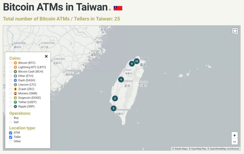 據加密貨幣 ATM 追蹤網站 CoinATMRadar 數據,目前全台灣共有 25 台比特幣 ATM(金管會提供的數據是 24 台 ) ,按縣市來看,台北市 11 台、新北市 2 台、桃園市 4 台、新竹 2 台、台中市 2 台、台南市 2 台、高雄市 2 台。