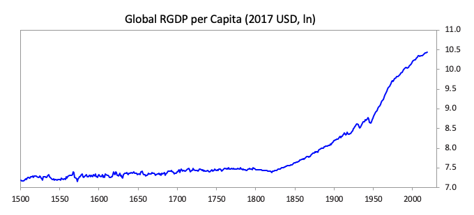 下圖顯示了過去 500 年全球人均產值(估算的實際GDP)的變化,也可說明這點。