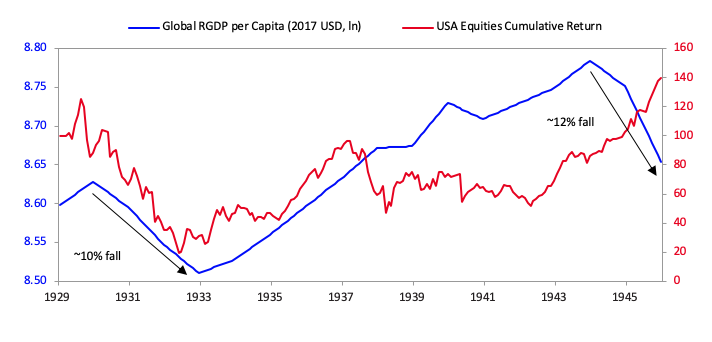 來到戰爭尾聲時,全球人均 GDP 大降了約 12%,主要導因於戰敗國的經濟崩潰。