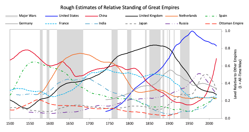以上的折線圖地清楚地講述大國們是如何崛起和衰弱的,等等我還會引入其他細項因素,但在此之前先讓我簡述一下本文的重點 —— 週期。