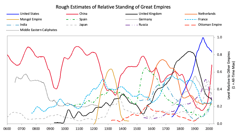 如下表所示,在 1500 年前,中國幾乎沒有一刻不是最強大的,期間阿拉伯的阿拔斯帝國、法國、蒙古、西班牙和鄂圖曼帝國也曾崛起。