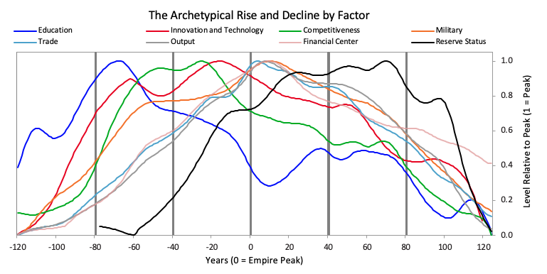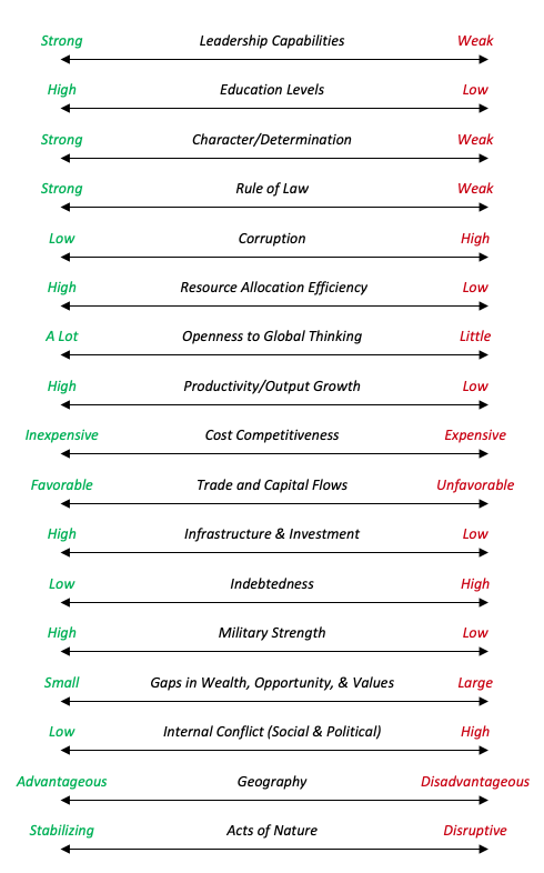 他們是: 1.教育、2. 競爭力、3. 科技、4. 經濟產出、5. 貿易份額、6. 軍事實力、7. 金融中心實力和 8. 儲備貨幣。雖然還有其他細項衡量標準,但讓我們先聚焦在這八個關鍵因素。