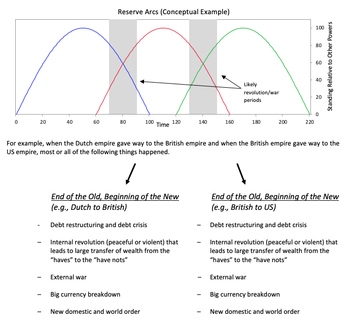 這種借貸模式透過讓國內民眾得以過度消費,並為軍事和戰爭發動提供資金,來增強基本國力以外的力量。過度借貸雖可維持一段時間甚至自我強化,因為如次能增加債權國的利息回報,從而加強該國儲備貨幣的地位。 - 但是當富強國家開始向發展中國家借錢,便是財富轉移的早期跡象之一。美國的人均收入在1980 年代時是中國的 40 倍,當時中國已經在買美國國債,因為美元是全球儲備貨幣;這就是發生財福轉譯的早期現象。同樣的,二戰時期英國跟比它窮的殖民地大量借貸;荷蘭在國力走像衰弱前也做過類似的事,直到當債權人不願持有開始拋售荷蘭盾時,荷蘭貨幣地位和經濟情況瞬間崩塌。美國也已經進行了大量借貸,並企圖藉由增發貨幣削減債務,儘管這尚未導致全球對美元和美債的需求減少。
