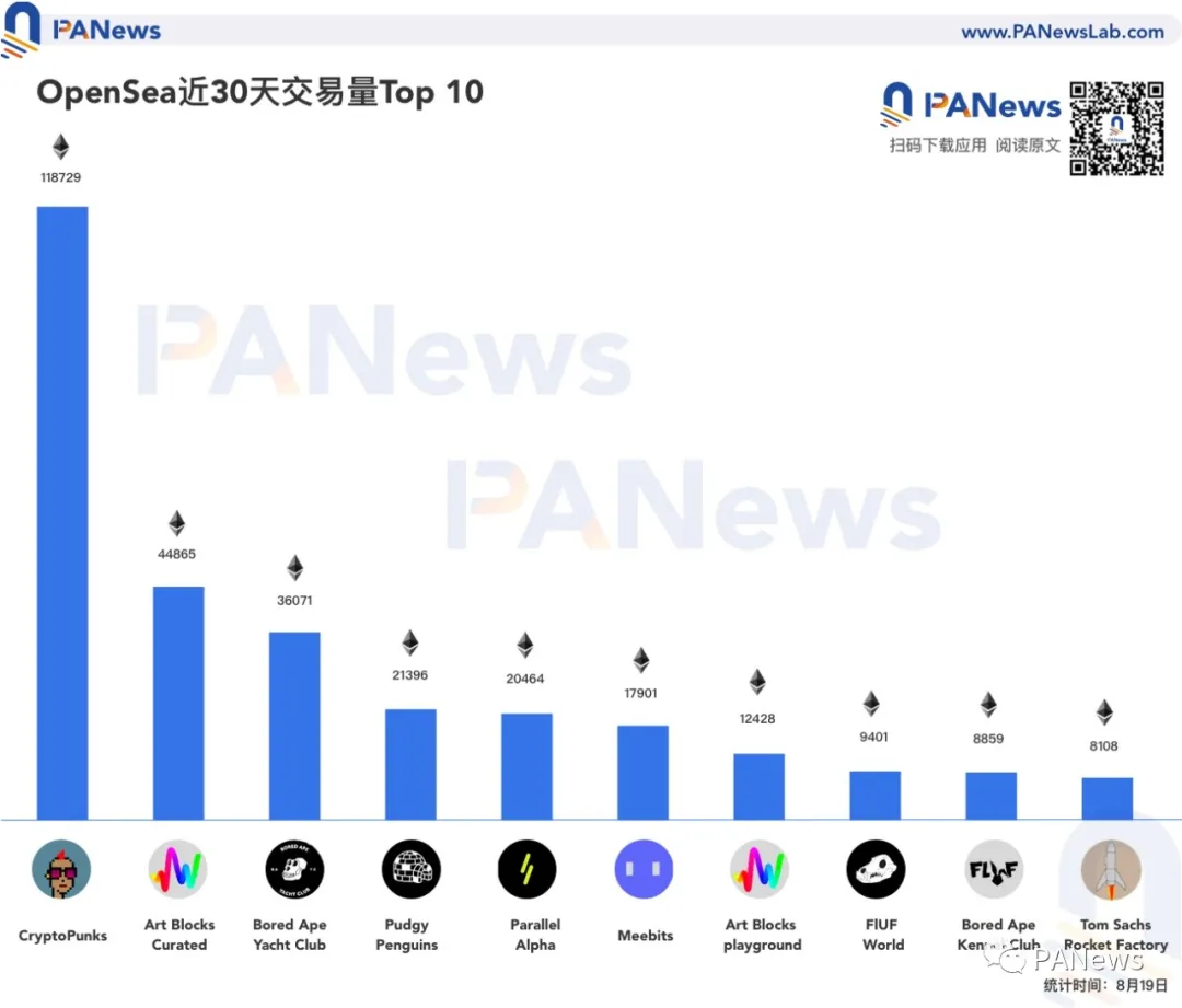而從下圖統計 OpenSea 近 30 天交易量排名前十的項目來看,這種突然的增速背後離不開 CryptoPunks、Art Blocks Curated、Bored Ape Yacht Club、Parallel Alpha 和 Meebits 等熱門專案的推動。