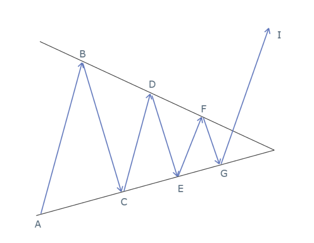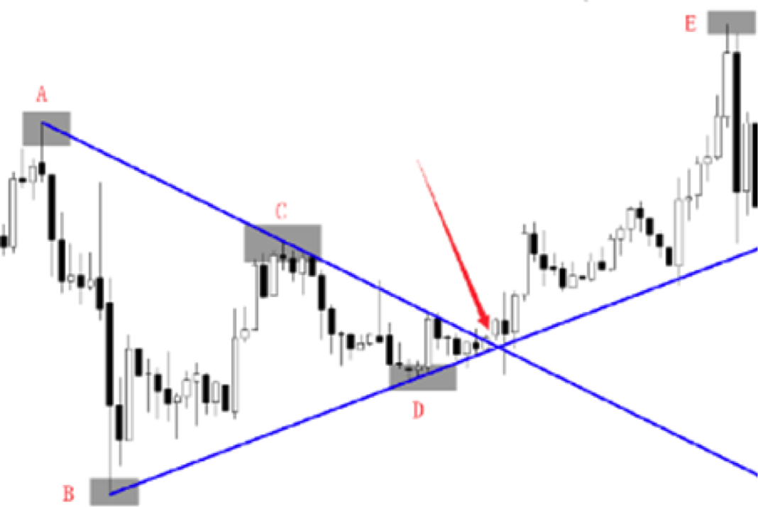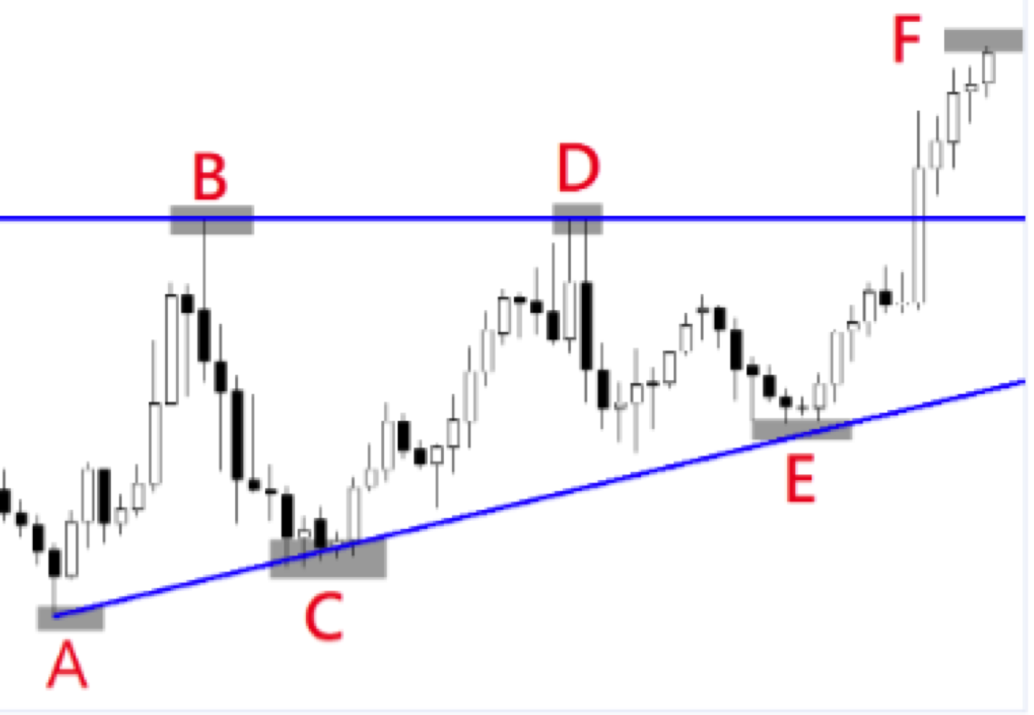 圖中演示的,就是標准上升型態的三角收斂區間,底部漸高(E>C>A)的同時高點價位變動量極小或是維持不變(B=D),且在突破區間的當下是以非常大的動能量去做突破,是非常典型的型態。