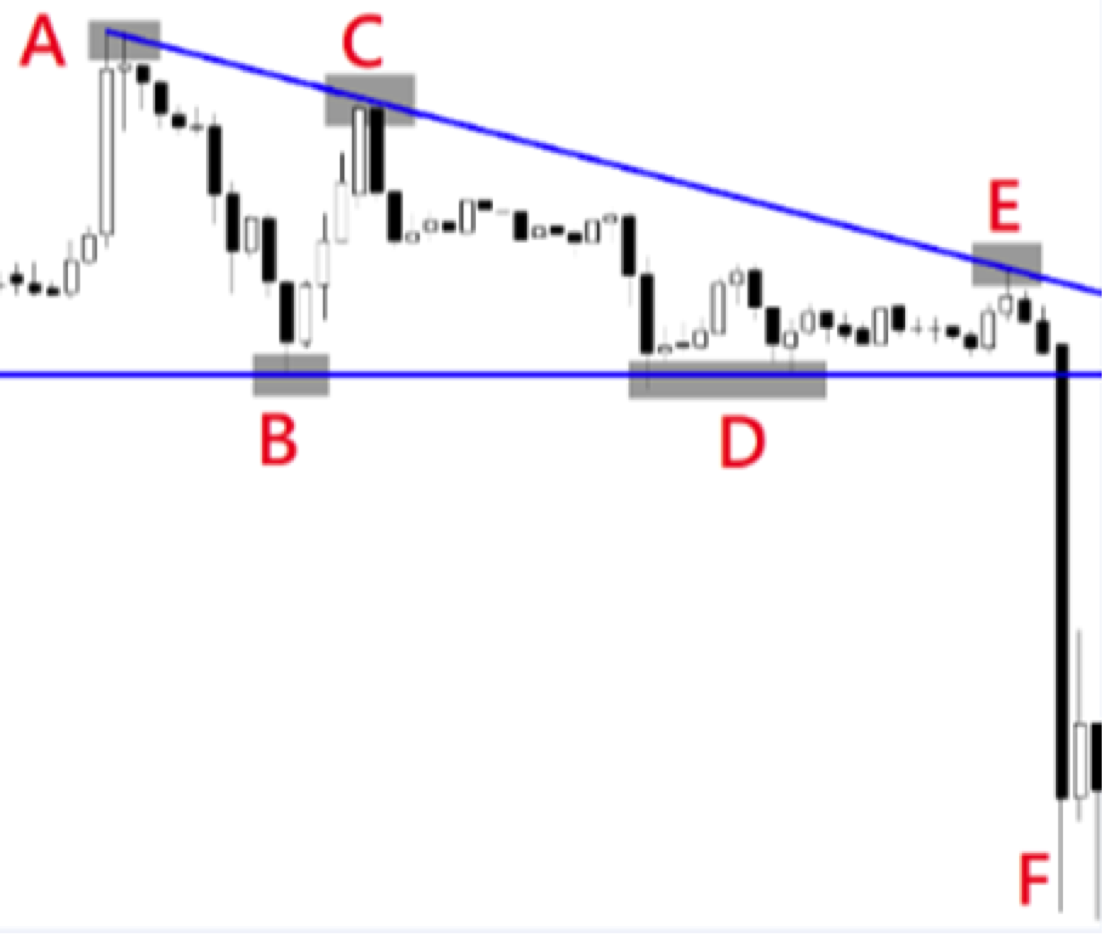上圖演示的,則是標準下跌型態的三角收斂區間,頂部漸低(E<C<A)的同時低點價位變動量極小或是維持不變(B=D),且在突破區間的當下是以非常大的動能量去做突破,屬非常典型的型態。