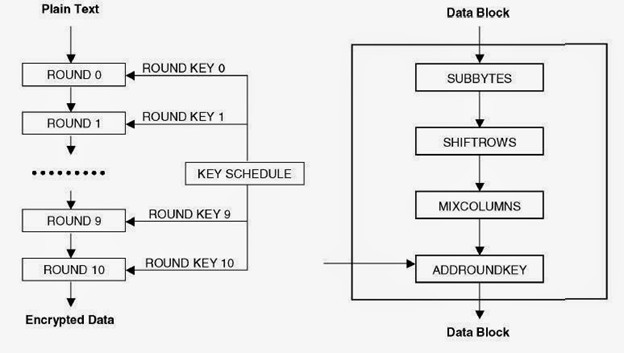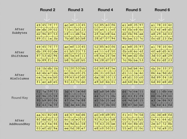 每一輪都包含幾個處理步驟,而每個步驟都包含 4 個相似但不同的階段,其中包括取決於加密密鑰本身的一個階段。在解密的時候,需要用同一把密鑰來反向重複操作、將密文恢復成原文。