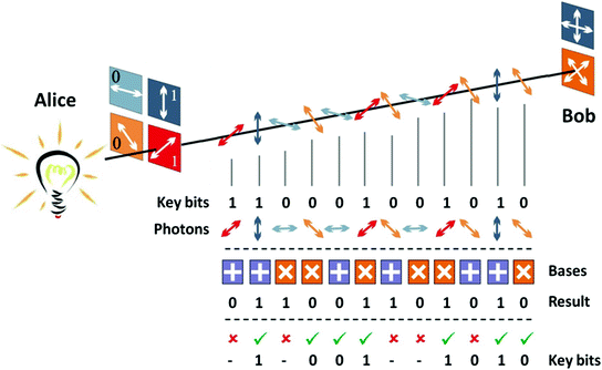 上面這個圖示說明了量子密鑰分發方案(BB84 協議),它實現了一種包含量子力學的密碼學協議,能夠保證安全通訊。它讓通訊雙方可以生成一個共享的隨機密鑰(是個對稱密鑰),這個密鑰只有他們雙方才知道,因此可以用於加解密消息。量子力學是一組描述組成宇宙的光子、電子和其它粒子運動規律的科學定律。