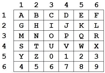 波利比烏斯密碼(Polibius Cipher)也是一種字符替換型密碼。在我這個示例中,我用的是一個 6×6 的二維矩陣,可以把所有的大寫字母和數字 0 到 9 都包括進去。然後我們可以得出下表: