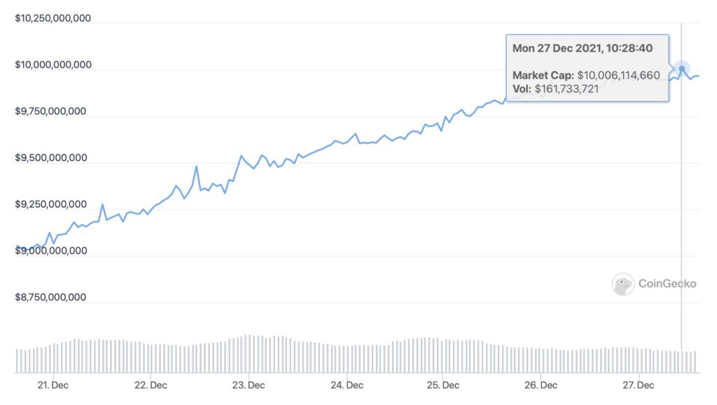 Terra 生態系的算法穩定幣「UST」在上週接連上架幣安和火幣之後,據 CoinGecko 數據,UST 市值今(27)日一度超過 100 億美元,成為有史以來首個達到百億美元規模的去中心化穩定幣。