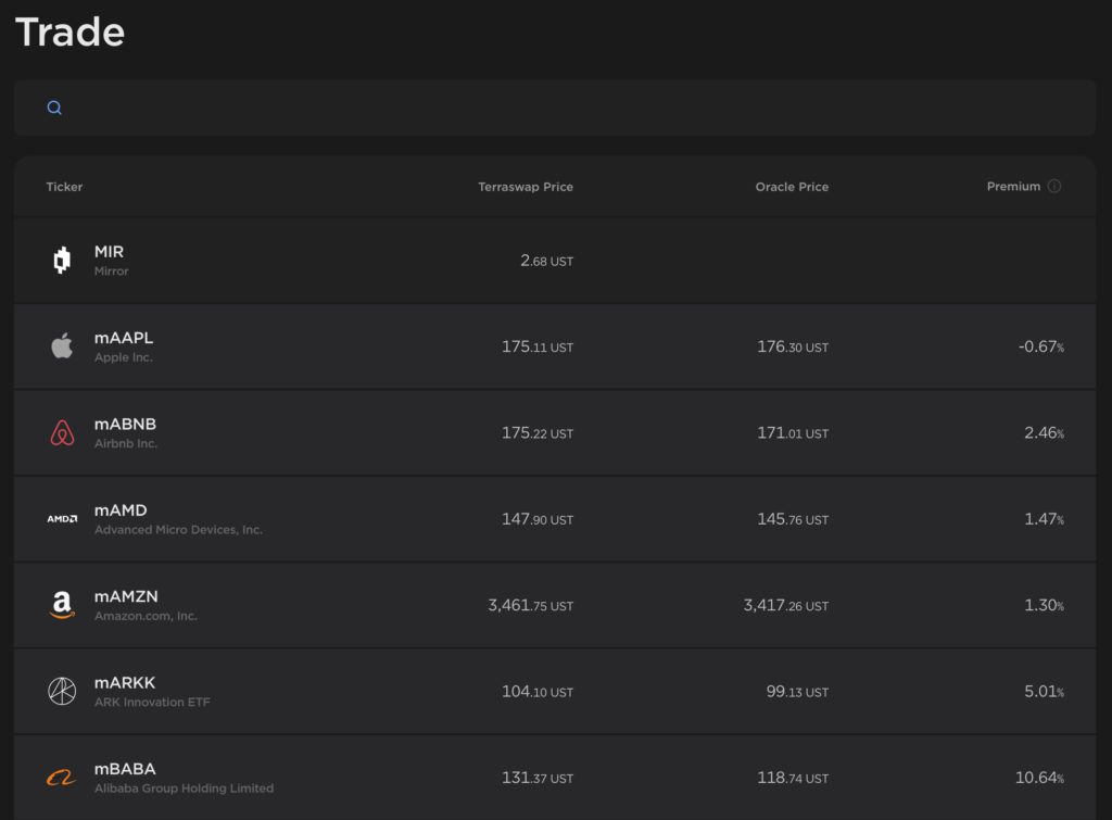 透過 Mirror ,用戶可以抵押 UST,來鑄造並交易股票、期貨、交易所基金等資產的合成代幣,目前平台鎖倉量已約 10.5 億美元,並將定時透過社群投票,陸續開放新的交易項目。
