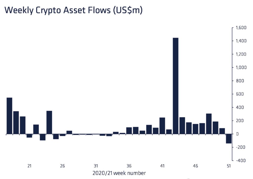 根據數位資產管理公司 CoinShares 週一發布的報告,經過 17 週的資金流入後,截至 12 月 17 日的 7 天內,加密貨幣基金的資金流出總額為 1.42 億美元,是有記錄以來最大的的單週流出;上一次大規模的資金流出是在 2021 年6 月上旬,當時週流出總額為 9,700 萬美元。
